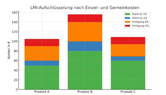 Die Höhe jedes Balkens entspricht den Gesamtkosten (LMI) des Produkts. So erkennt man sofort, welcher Anteil auf Einzel- oder Gemeinkosten entfällt.
