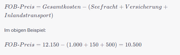 Der FOB-Preis wird berechnet, indem die Gesamtkosten um die Seefracht, Versicherung und Inlandstransport reduziert werden: